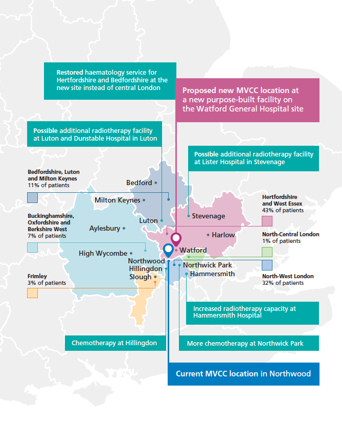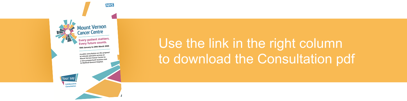 We are now consulting on our proposal to build a new modern cancer centre on the Watford General Hospital site, with outreach services into local hospitals, to replace the current Mount Vernon Cancer Centre in Northwood.