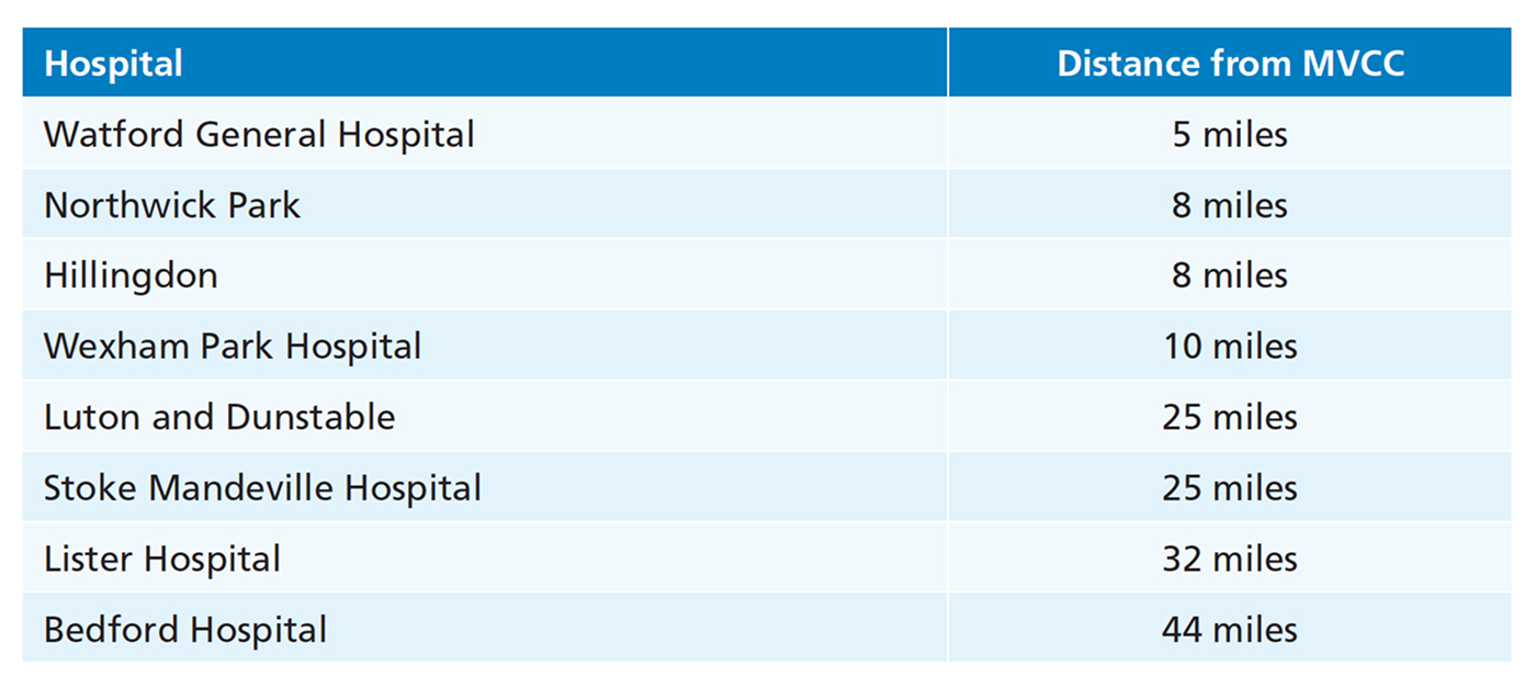 Watford General Hospital is the closest hospital site to the current service and is therefore the smallest change of any hospital we considered. The other hospitals that refer patients to MVCC all made a much bigger increase in travel times for a greater number of people.